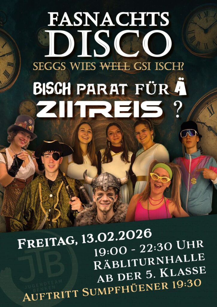 Am 13.02 findet üsi alljährlichi Fasnachtsdisco ide Räbliturnhalle vom 19:00-22:30 statt. Alli ab ab de 5. Klass sind herzlich willkomme! Wie au de Scharalass findet Disco underem Motto „seggs wies gsi isch“ statt.